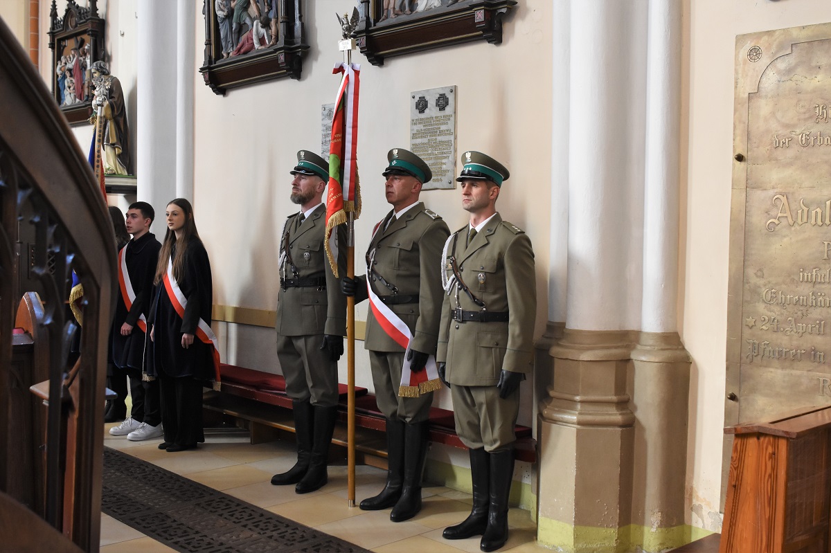 Poczet sztandarowy OSS SG w Lubaniu podczas Mszy świętej. -